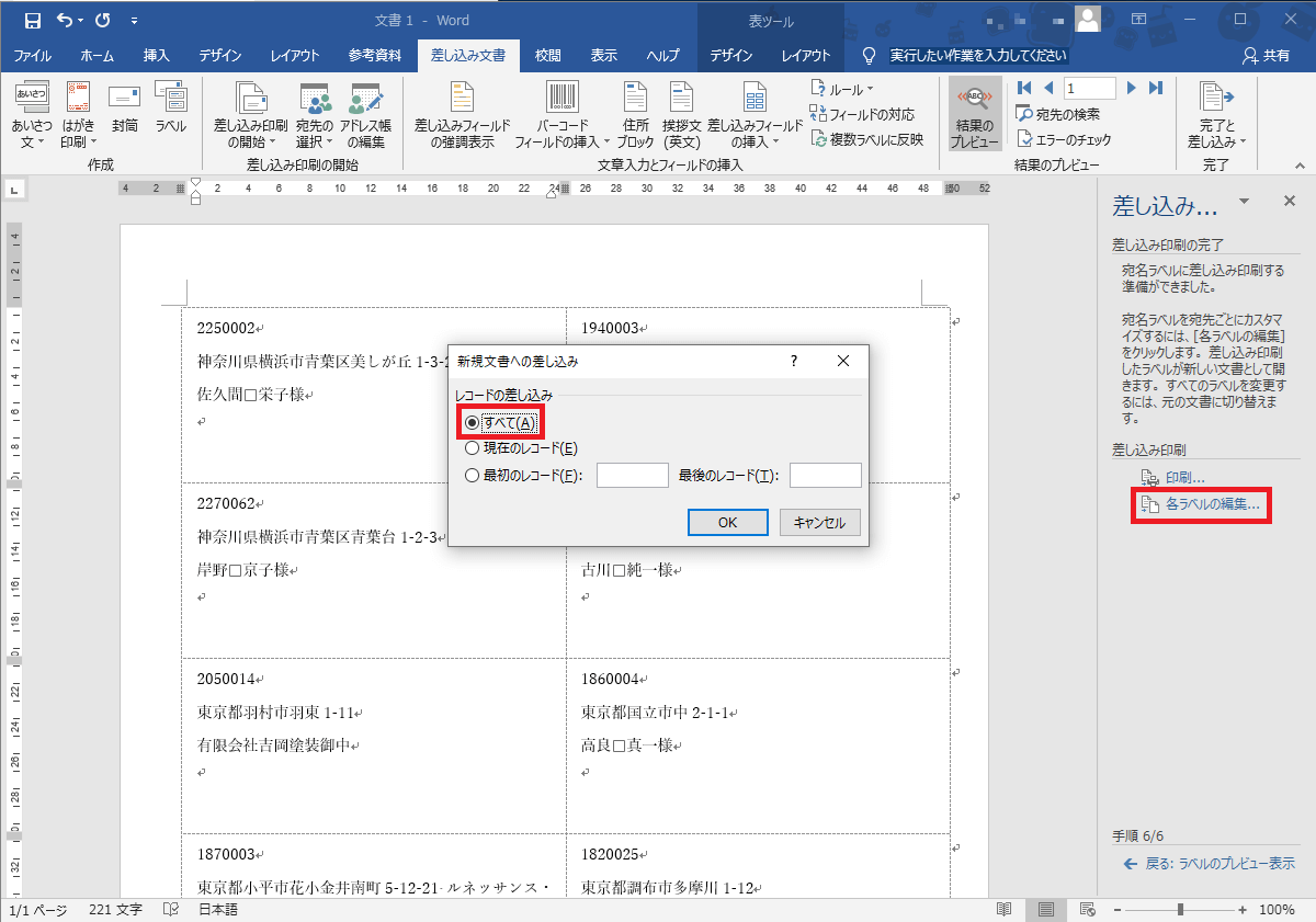 ⑬このまま印刷もできますが、さらに編集をする場合は「各ラベルの編集」を選択します。レコードの差し込みは「すべて」を選択し、印刷開始位置の調整や文字情報の変更等を直接編集してレイアウトを整えご利用ください。