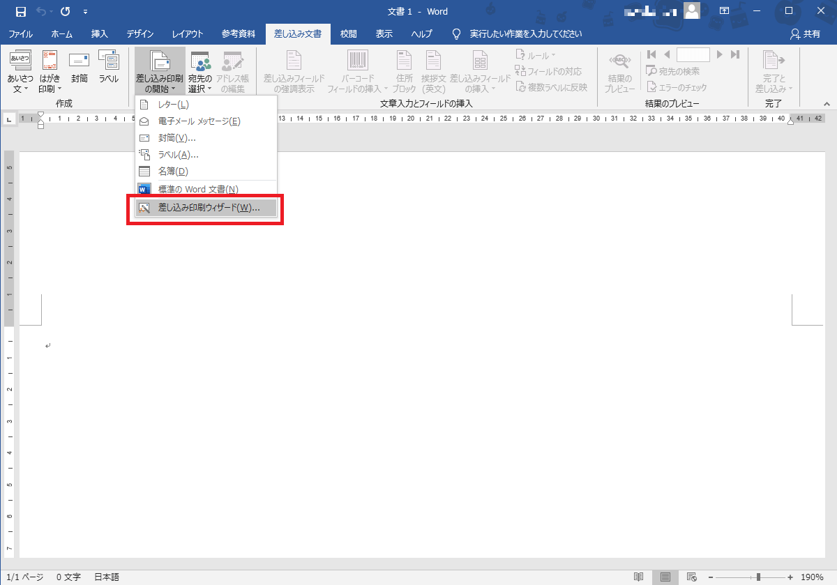 ③ Microsoft Wordを起動し、[差し込み文書]タブの「差し込み印刷の開始」-「差し込み印刷ウィザード」を選択します。
