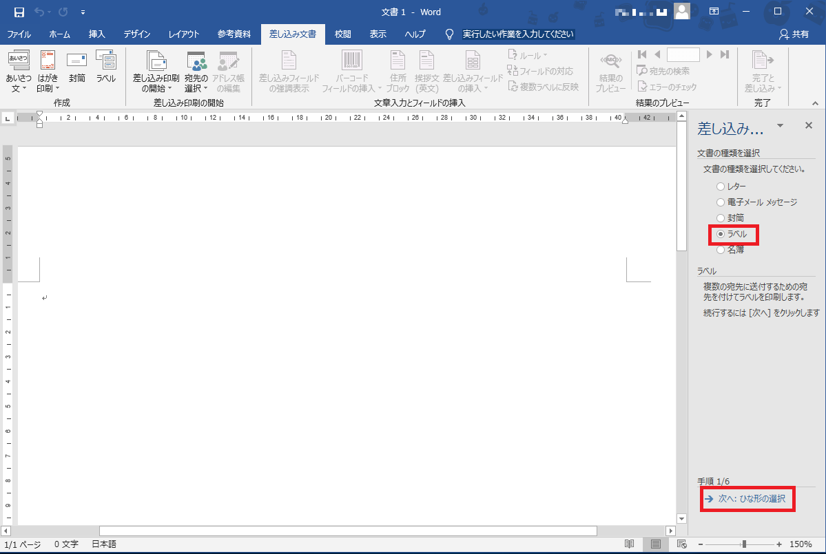 ④右側「差し込み印刷」の[ラベル]チェックを選択し、「次へ:ひな型の選択」へ進みます。