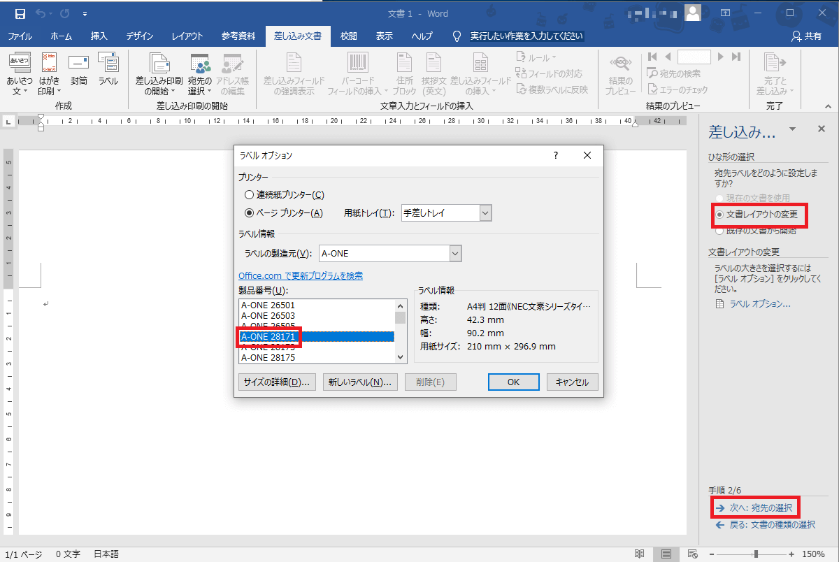 ⑤「ラベルオプション」で用紙を選択し、「次へ:宛先の選択」へ進みます。