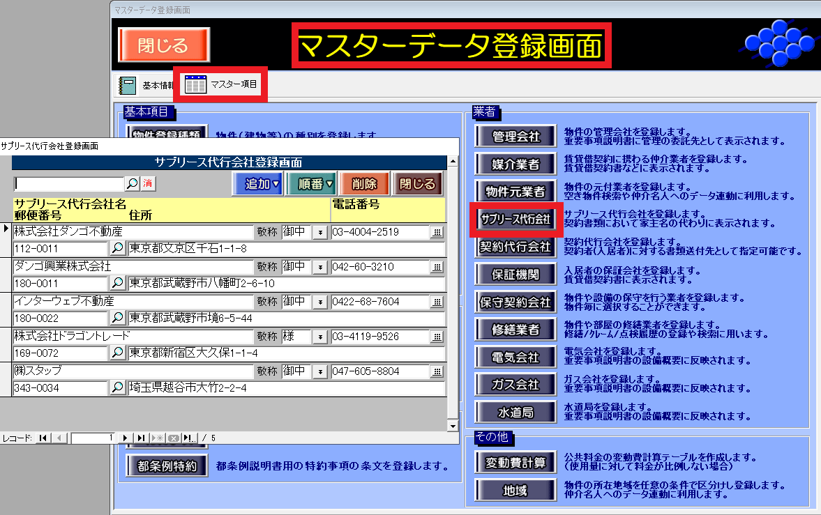 ①[マスターデータ登録画面]の[マスター項目]タブでサブリース代行会社を登録します。