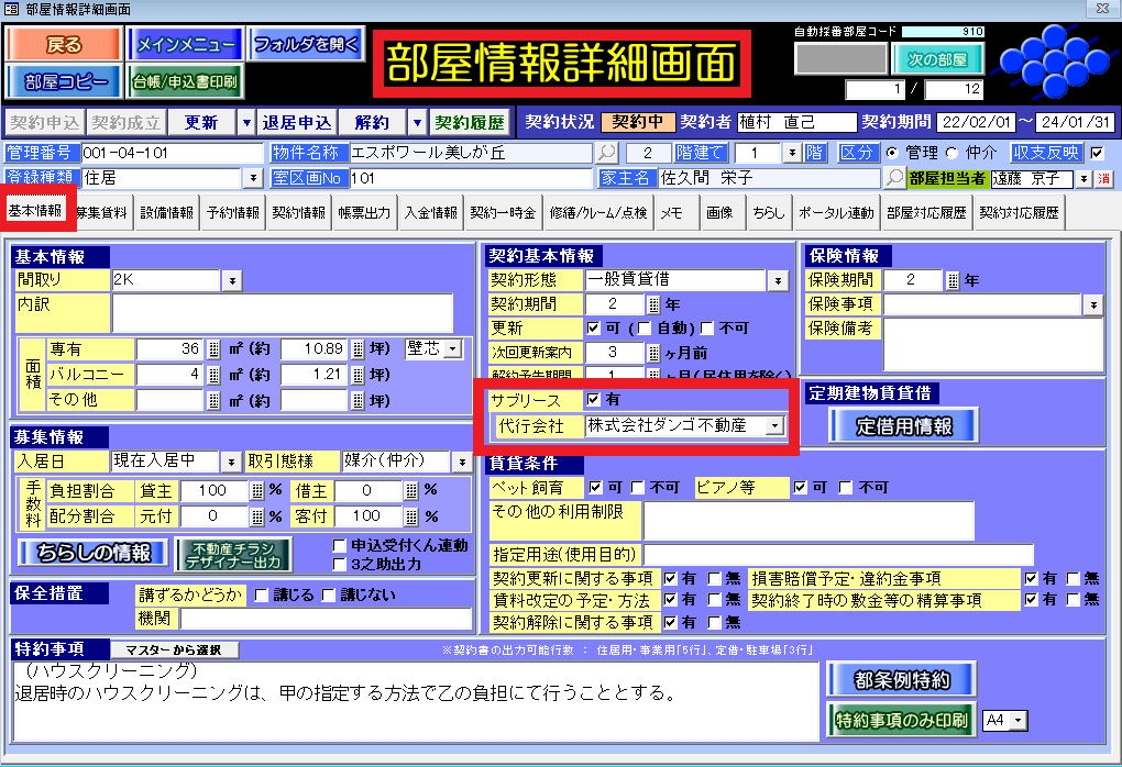 ②[部屋情報詳細画面]の[基本情報]タブで[サブリース]チェックを付け、①で登録したサブリース代行会社をプルダウンから選択します。