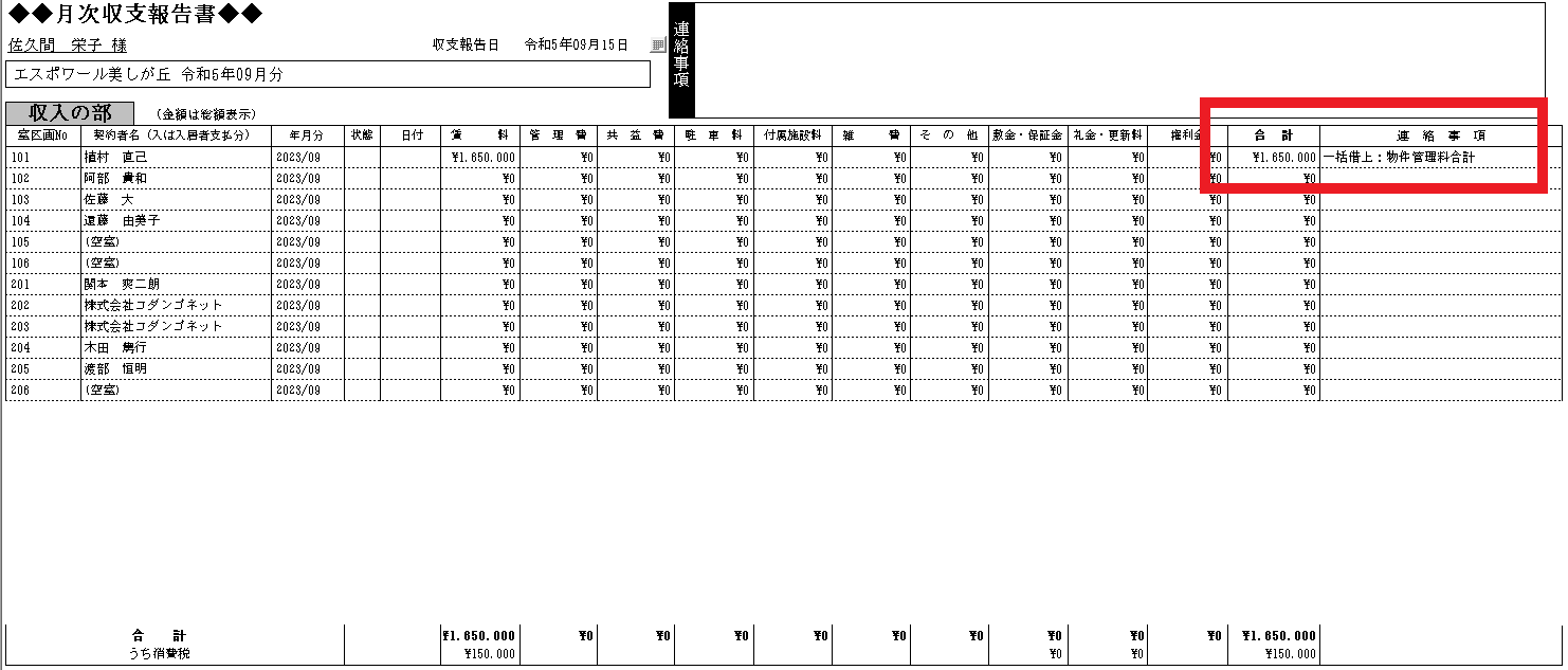 月次報告書の「収入の部」に借り上げ料の金額を表示し、「連絡事項」欄に「一括借上:物件管理料合計」と明記することができます。