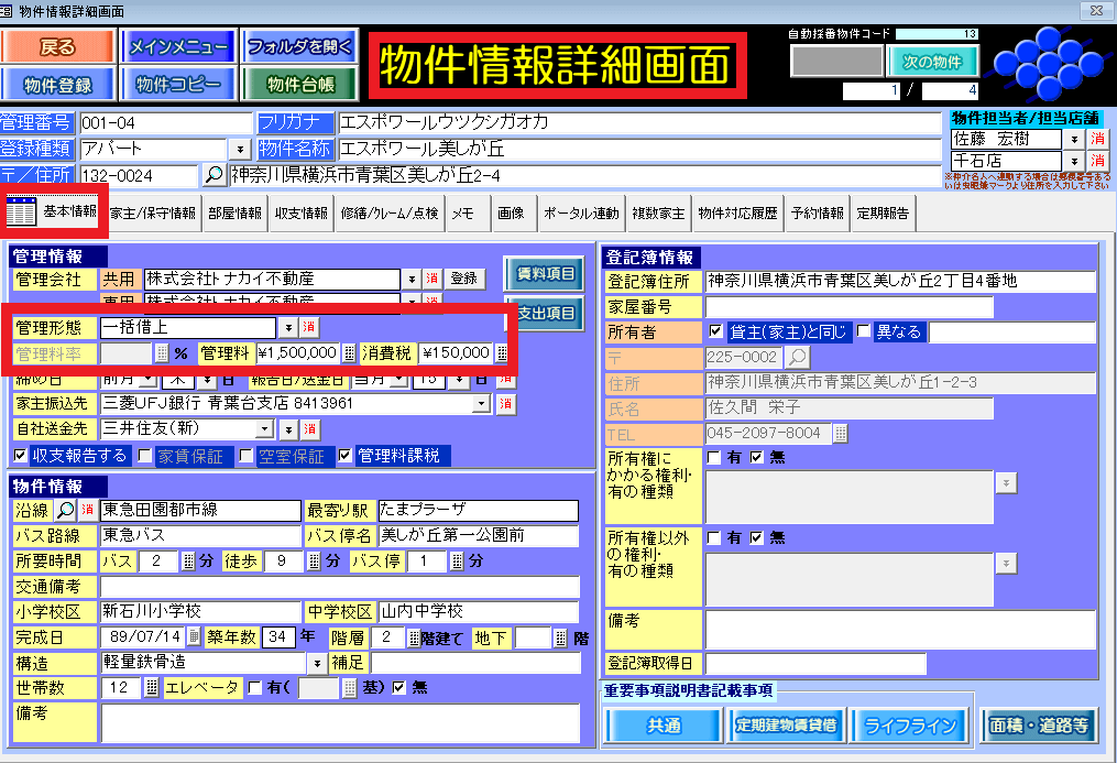 操作方法は、[物件情報詳細画面]の[基本情報]タブで管理形態「一括借上」を選択し、「管理料」欄に借上料金を入力します。