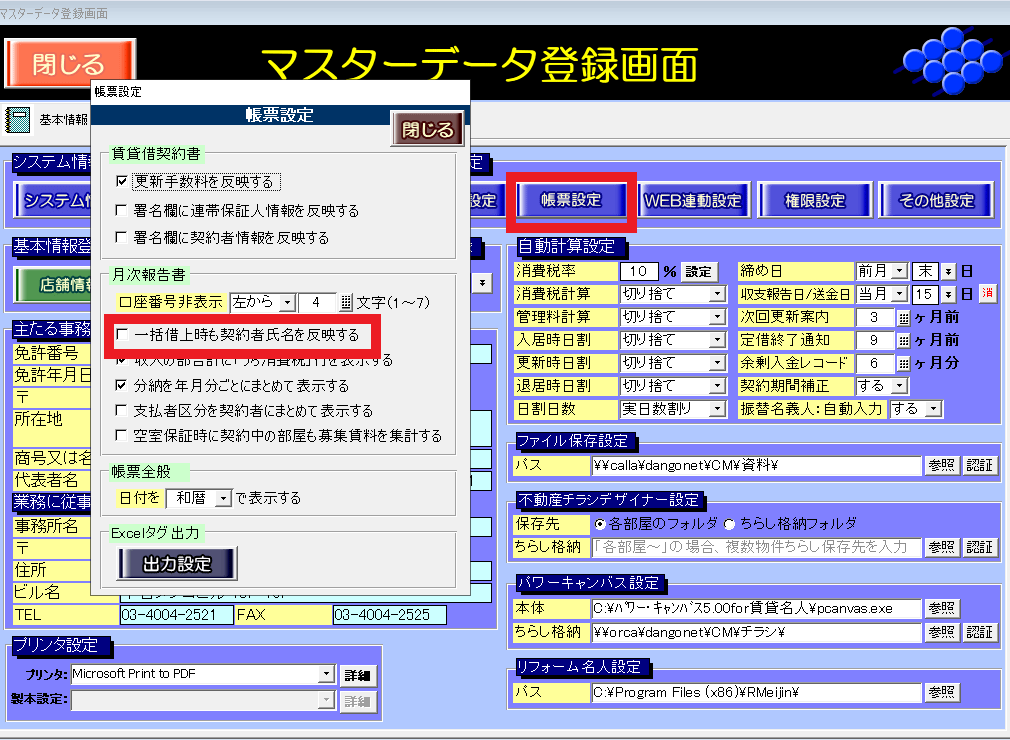 設定は、[マスターデータ登録画面]の[基本情報]タブの[帳票設定]ボタンを押し、帳票設定画面の[一括借上時も契約者(入居者)氏名を反映する]チェックを外します。