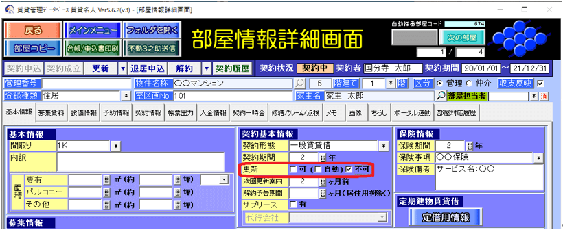 更新案内画面・定借契約終了通知画面の表示対象から除外するには、[部屋情報詳細画面]の[基本情報]タブの更新欄[可]チェックを外すか、[不可]チェックを付与します。