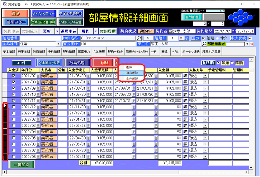 入金情報詳細画面、督促状作成画面の表示対象から除外するには、[部屋情報詳細画面]の[入金情報]タブに移動し、管理終了後の入金レコードを削除します。