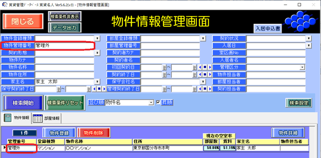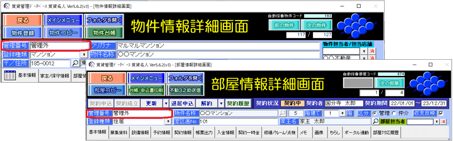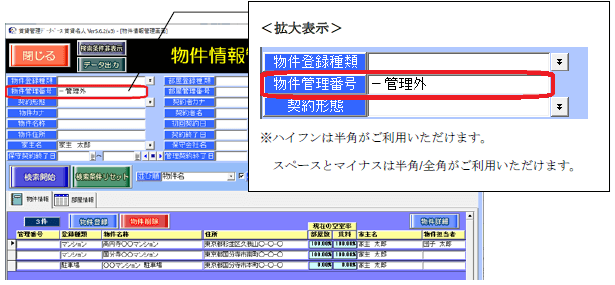 入力例として「管理外」「 管理除外」「 売却」「 解体」「 募集中止」「 non-managed」「 ★」 等、これらの文字を「管理番号」に入力することで、画面上で視聴覚的に物件の状態を把握し易くなることが期待できます。