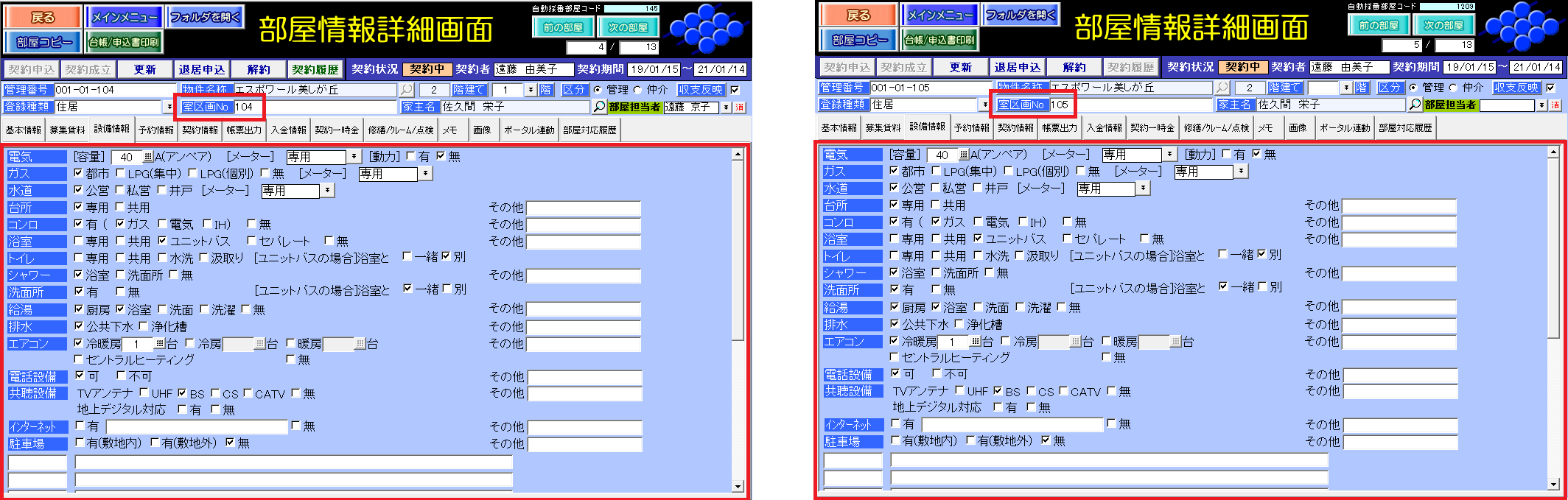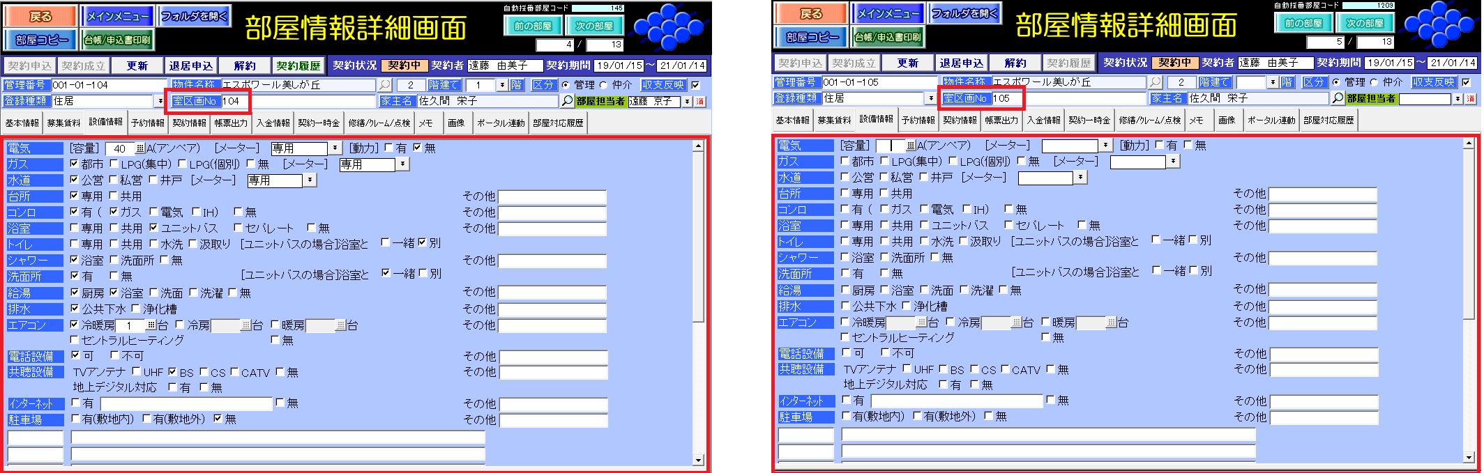 例:「104」に入力されている設備情報を「105」にコピーします 。