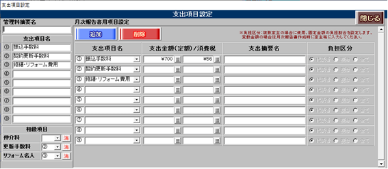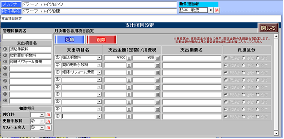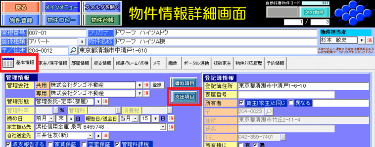 (1)物件情報詳細画面の[基本情報]タブの「支出項目」をクリックします。