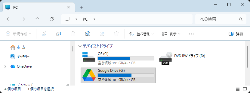 「パソコン版Googleドライブ」をインストールし、ドライブレター(例:G)を割り当てる方法です。