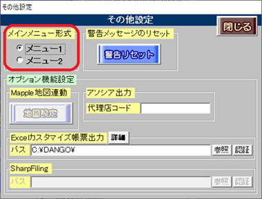 マスターデータ登録画面の[基本情報]タブの[その他設定]ボタン内で操作します。「メニュー1」「メニュー2」の選択ができます。