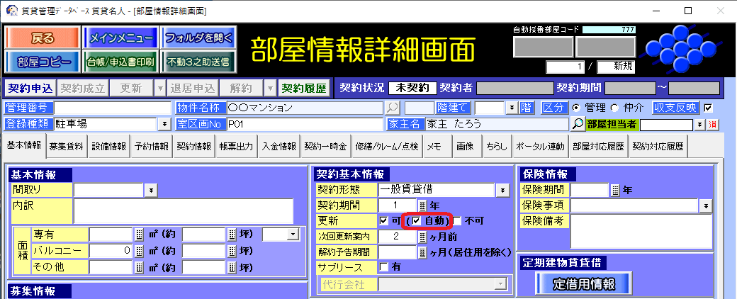 部屋情報詳細画面の基本情報タブ[更新]欄の[自動]チェックボックスのチェックを付けます。