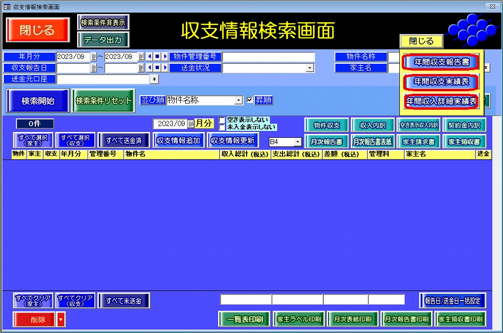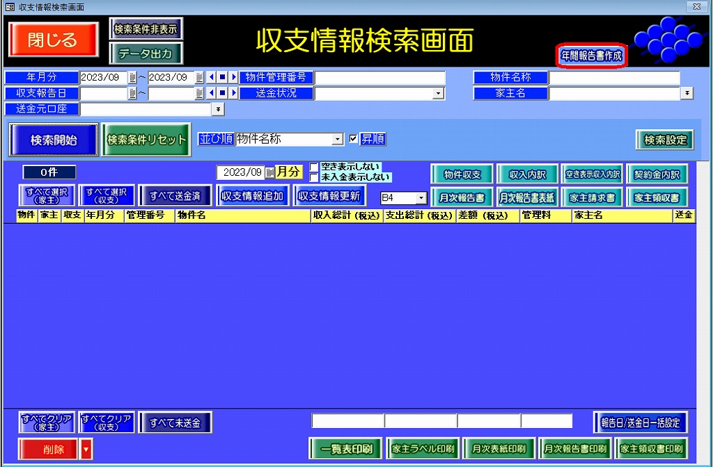 『賃貸名人』で年間の収支報告書を印刷することはできますか。
