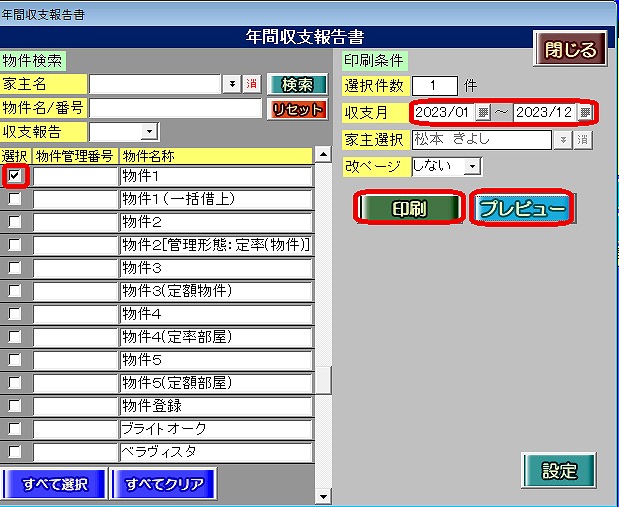③収支月(期間:1年)を指定し、年間報告書を作成したい物件名称の[選択]チェックを付け、[印刷]又は[プレビュー]ボタンで内容を確認します。