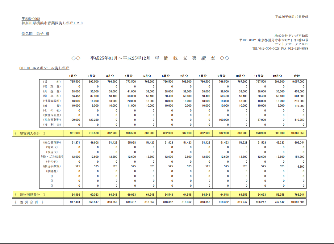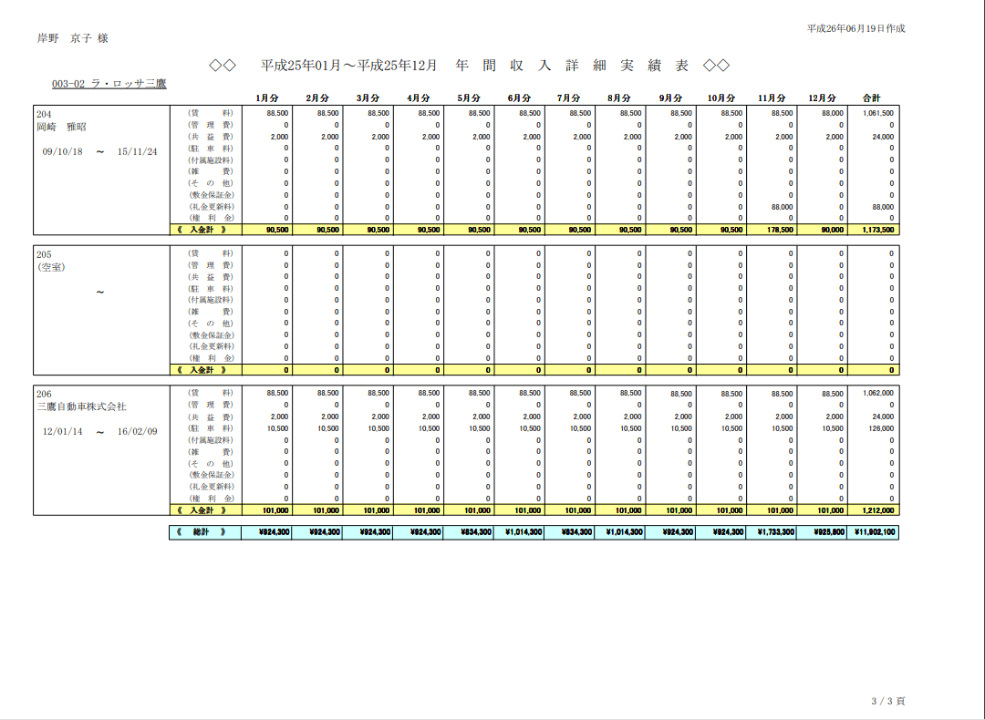 各物件の収入金内訳を、各入居者毎、各月毎に印字します。