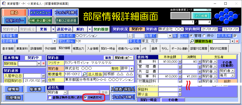 部屋情報詳細画面の[契約情報]タブにある[DM送付可]チェックボックスで、契約者毎に宛名ラベルシールの出力要否を記録します。