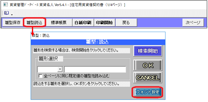 Windows10「Creators update」以降、画面上のフォントのスケーリングが仕様変更されました。そのため、帳票の画面上および印刷物のフォントを任意のフォント種類に変更できるよう、帳票内の[雛型読込]ボタンの[フォント設定]に機能を装備しています。
