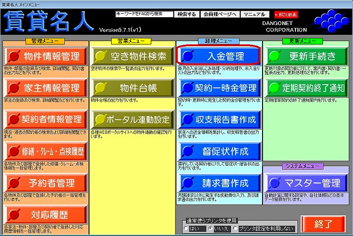 ①メインメニュー[入金管理]ボタンを押し、入金情報管理画面を開きます。