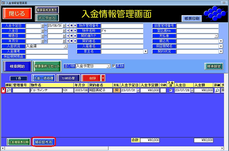 ②領収証を出力したい入金レコードにカーソルをあて、[領収書作成]ボタンを押します。