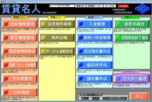 ①メインメニュー[マスター管理]ボタンを押します。