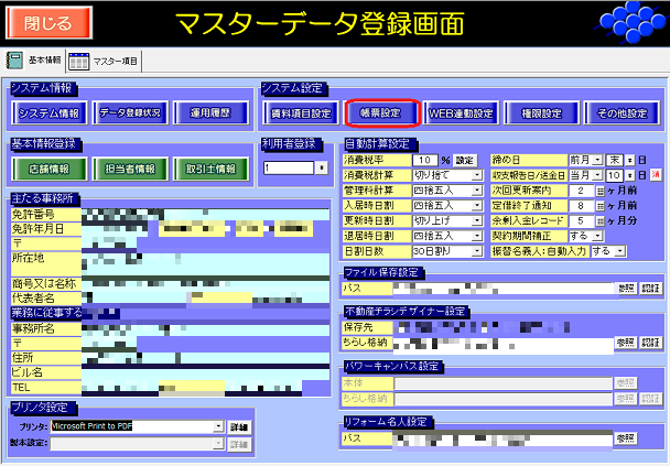 ②マスターデータ登録画面が開いたら画面上部にある[帳票設定]ボタンを押します。