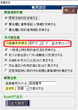 ③帳票設定画面の月次報告書「口座番号非表示」欄で、任意の設定に変更します。