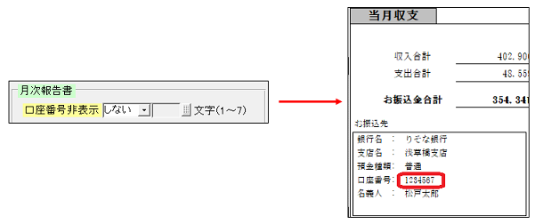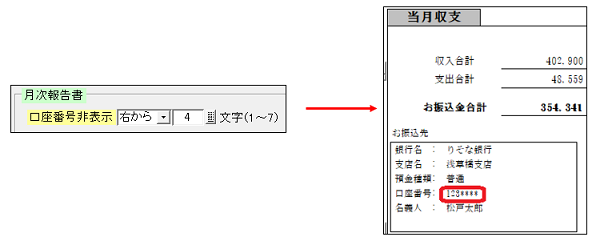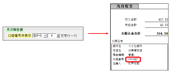 月次収支報告書のお振込先の口座番号は、「*」印で伏字にすることができます。