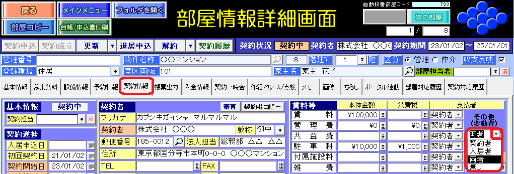 [契約情報]タブの 「賃料等」欄の「その他(変動費)」を「両者」で選択します。