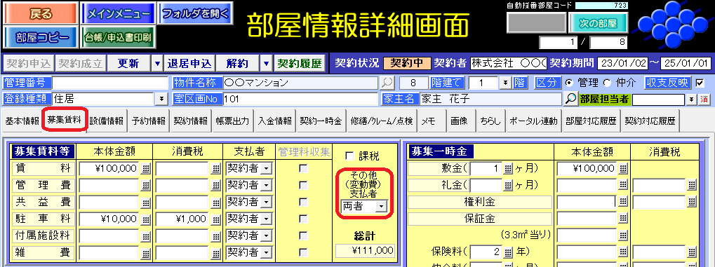 次回契約者も同条件の場合、 [募集情報]タブの「募集賃料等」欄の「その他(変動費)」も「両者」を選択します。