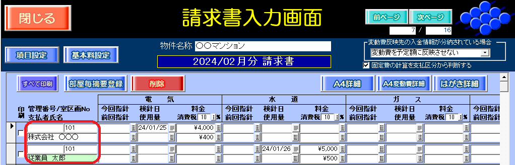 請求書を追加すると、請求書入力画面は支払者「契約者」「入居者」の両レコードを表示します。