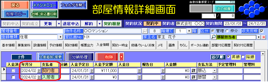 入金情報を追加すると、[入金情報]タブは支払者「契約者」「入居者」で分けて金額表示します。