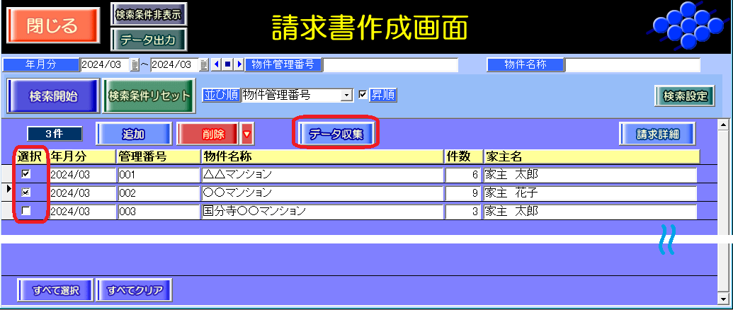 請求書発行前に滞納の状況を一括して集計するには、請求書作成画面の[データ収集]ボタンを使います。