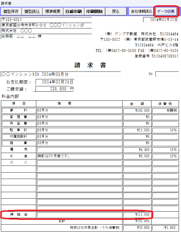 請求書作成時は、「繰越金」欄の金額は空欄(ブランク)です。