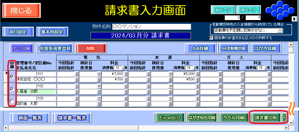 請求書作成画面で対象物件の[印刷]チェックを先に付け、[請求書印刷]ボタンをクリックします。
