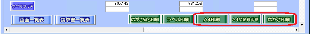 請求書作成画面の右下は、[A4印刷][A4変動費印刷][はがき印刷]ボタンで配置しています。