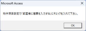 [部屋毎に摘要を入力する]チェックを付けていない状態で[項目設定]ボタンをクリックすると、以下のアラートを表示します。