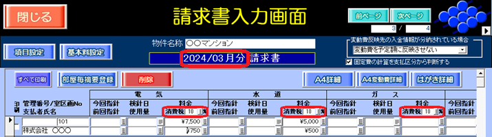 例えば、「請求月(年月分)」が「2024/03月分」の場合、「消費税」欄は「10%」を表示します。