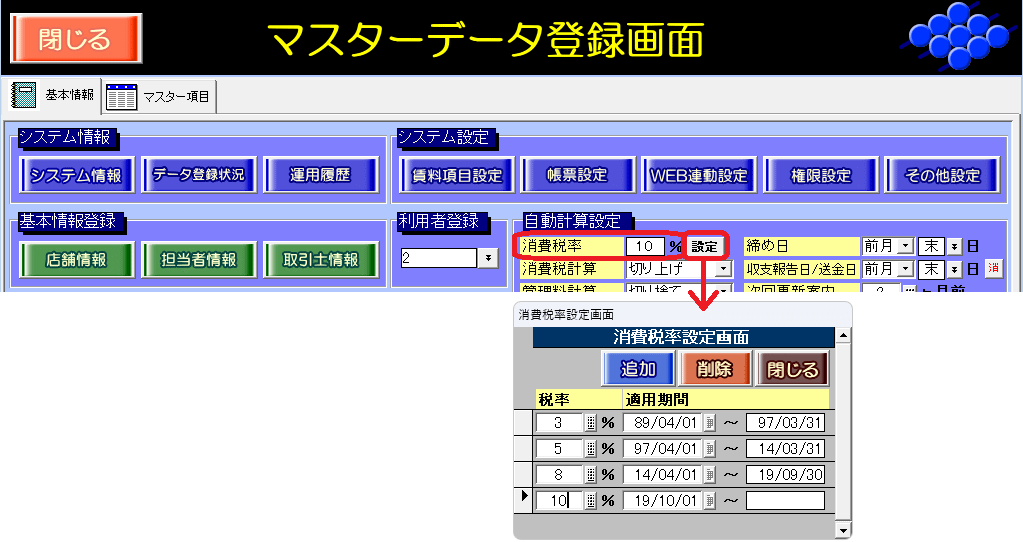 「消費税」欄の税率表示は、請求書の「請求月(年月分)」を基準とし、マスターデータ登録管理の自動計算設定の「消費税率」で設定した適用期間に当たる税率を表示します。