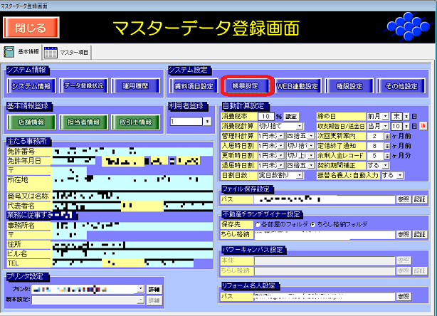 ②マスターデータ登録画面内[帳票設定]ボタンを開きます。