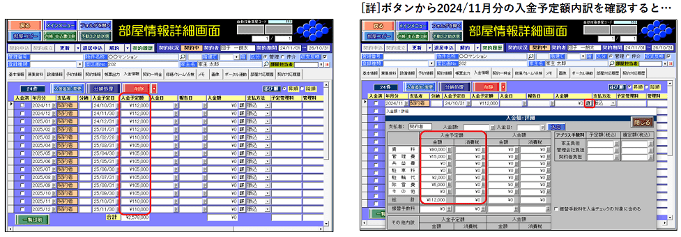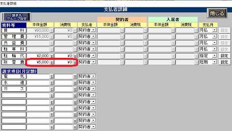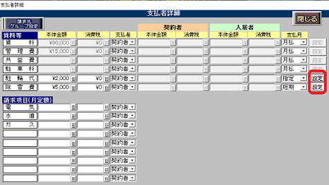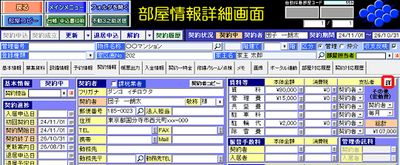 ①部屋情報詳細画面[契約情報タブ]賃料等欄の[詳]ボタンを押し、「支払者詳細」を開きます。