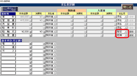 部屋情報詳細画面[契約情報タブ]賃料等欄にある[詳]ボタンで、 月額賃料項目に支払月を設定することができます。支払月の選択肢は下記3種類です。