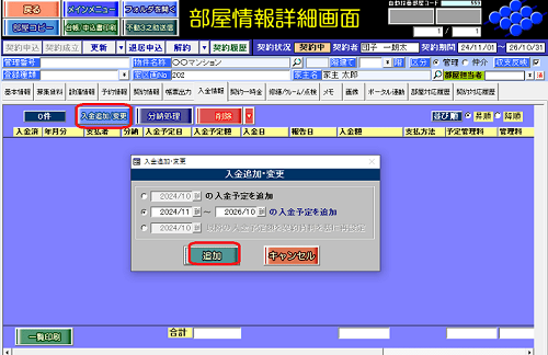 ⑥部屋情報詳細画面[入金情報]タブで[入金追加/変更]ボタンを押し、入金レコードを追加します。