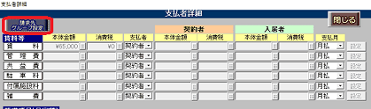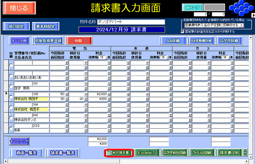 ③請求データの追加が完了したら、[請求詳細]ボタンを押し請求書入力画面を展開します。光熱費などの変動費請求が発生する場合は、予め請求書入力画面で各部屋料金等を入力しておきます。
