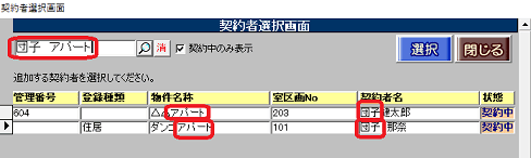 「部屋管理番号」「物件名称」「室区画No.」「契約者名」が検索対象です。