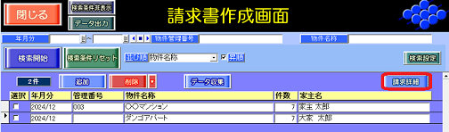 ④ 請求書を作成する部屋の請求レコードを選択し、[統合請求書]ボタンをクリックします。