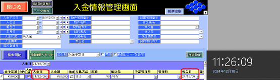①入金情報管理画面を開き、「入金日」欄に任意の日付を指定します。