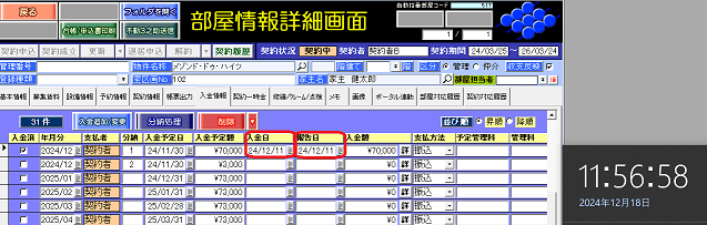 ③「入金日」欄に入力した日付が、入金済みチェックを付与したレコードの「入金日」と「報告日」にセットされます。