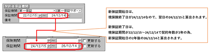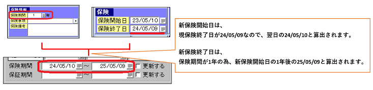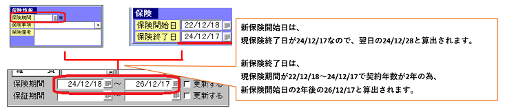 現保険終了日および入力済の保険期間の年数に基づいて、新保険開始日・保険終了日を算出します。