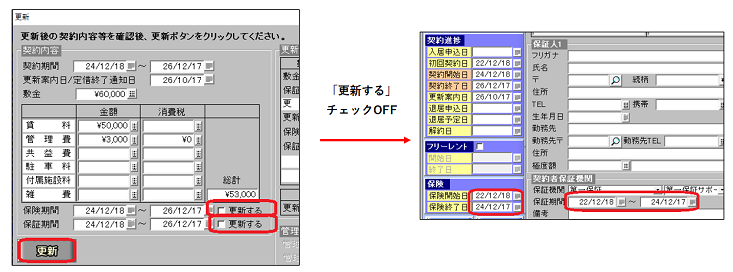 [更新する]チェックを付与して更新処理を実施すると、「契約開始日」「契約終了日」とあわせて「保険開始日」「保険終了日」および「保証期間」も変更・更新されます。